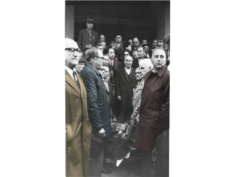 בונדאים בלוייה של ארטוסקי בכניסה לבית ברית העבודה, קלישר 48 ת"א. ראשון מימין: מנדל שיין